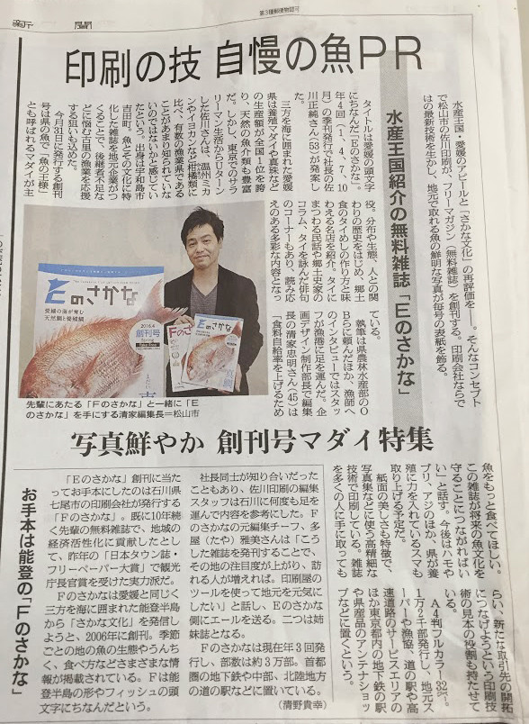 一方、石川県で能登の“さかな文化”を発信するフリーペーパー「Fのさかな」が、2006年(平成18年)7月に創刊されたことを知りました。発行元である石川印刷株式会社 (石川県七尾市)の佐味貫義社長(当時)とは以前から面識があったので、アドバイスをいただきながら、愛媛で類似の情報誌を発行することを考えましたが、弊社には発行に必要な“魚に関する専門知識”がなかったため、諦めていました。