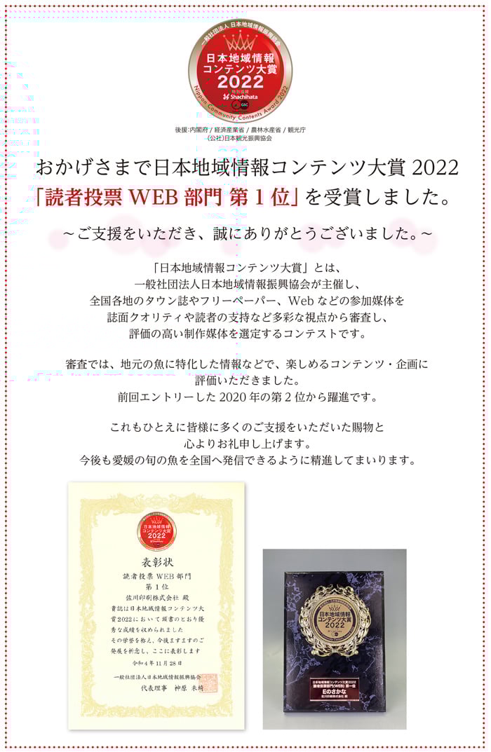 このような賞をいただけたのは、皆さまの応援があってのことで、心より感謝申し上げます。 これからも、愛媛の魚の情報発信ができるよう、努力してまいります。 これからも、応援をよろしくお願い致します。