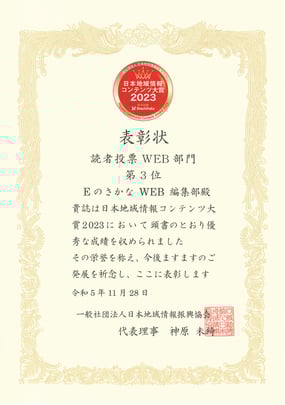 「Eのさかな」は、2023年秋に開催された、日本地域情報コンテンツ大賞2023にエントリーいたしましたところ、ご投票いただいた皆様のおかげで「読者投票部門(WEB)」第3位を受賞することができました。